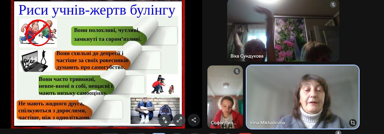 Для учнів 7 класу було запропоновано класним керівником Пуховою А.В., година спілкування «Толерантність - шлях до миру». Діти були пригадали терміни «булінг», «кібербулінг»,«толерантність», правила спілкування в колективі, способами реагування в ситуації булінгу, мали змогу збагатити свої знання про безпечне і відповідальне використання Інтернету. Учні дізналися про правову відповідальність за булінг, а також вчилися безпечно користуватися соціальними мережами та протидіяти кібербулінгу, зрозуміли, чому потрібно бути більш толерантними та дружніми.