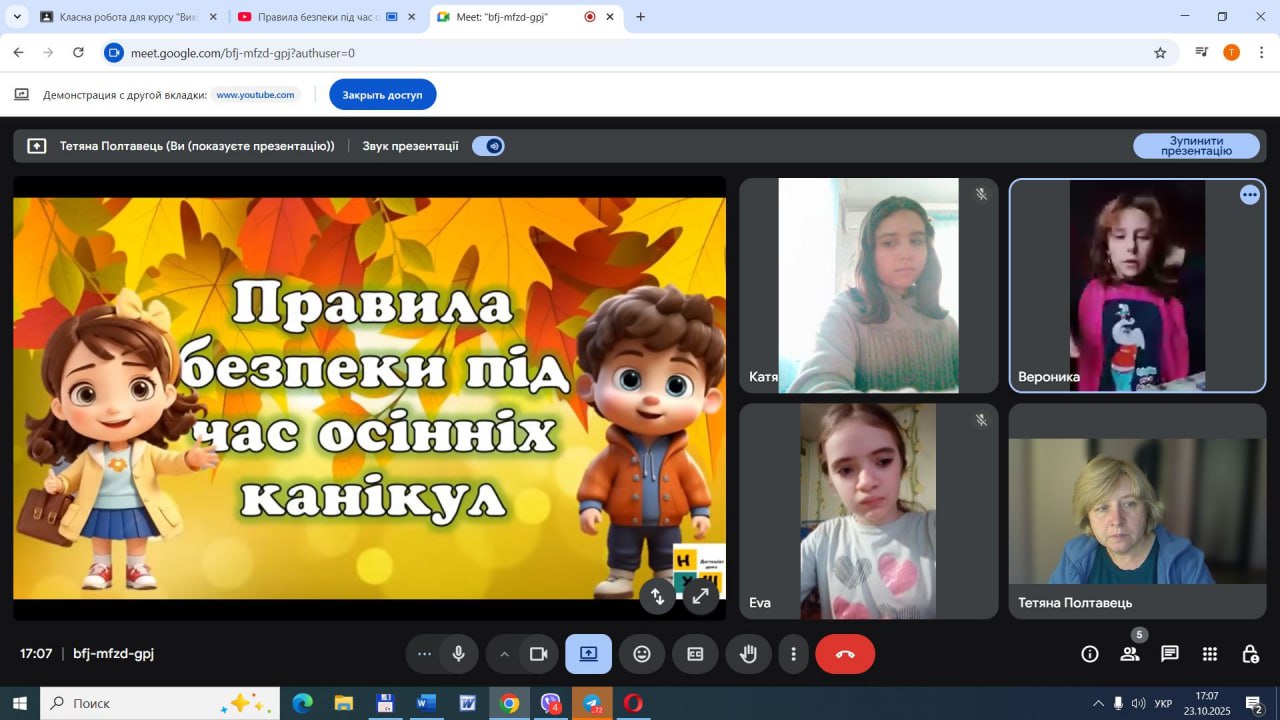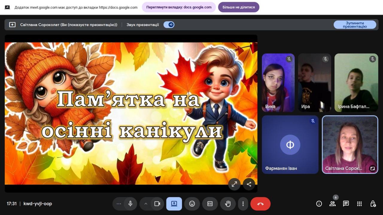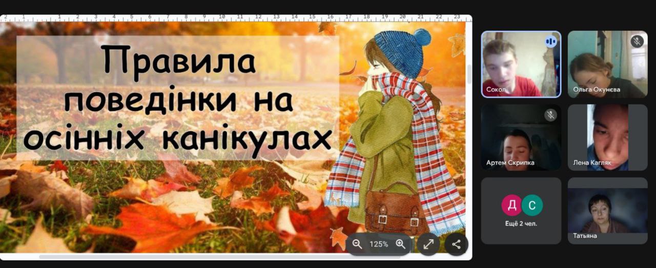 На передодні осінніх канікул онлайн-форматі, були проведені інструктажі, виховні години, години спілкування, тематичні бесіди, вікторини з учнями щодо дотримання Правил безпеки життєдіяльності під час осінніх канікул в умовах воєнного стану.  Під час заходів зі здобувачами освіти розглядались питання дій у випадку надзвичайних ситуацій, дій у разі оголошення про загрозу виникнення надзвичайної ситуації, у тому числі сигналу «Повітряна тривога»,  правил пожежної безпеки, електробезпеки, безпеки дорожнього руху, правил поведінки в громадських місцях, поводження з незнайомими людьми та предметами, тощо. Окрім того, опрацьовані теми безпеки дітей в інтернеті та профілактики інтернет-залежності. Проведені заходи щодо збереження життя та власного здоров’я  під час канікул з урахуванням небезпечних факторів воєнних дій, педагоги нагадали здобувачам освіти про потенційні ризики та небезпеки під час канікул.