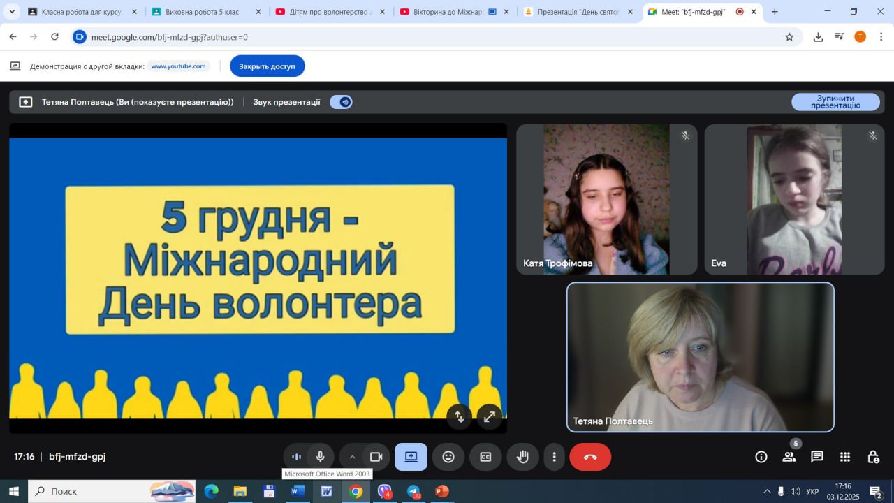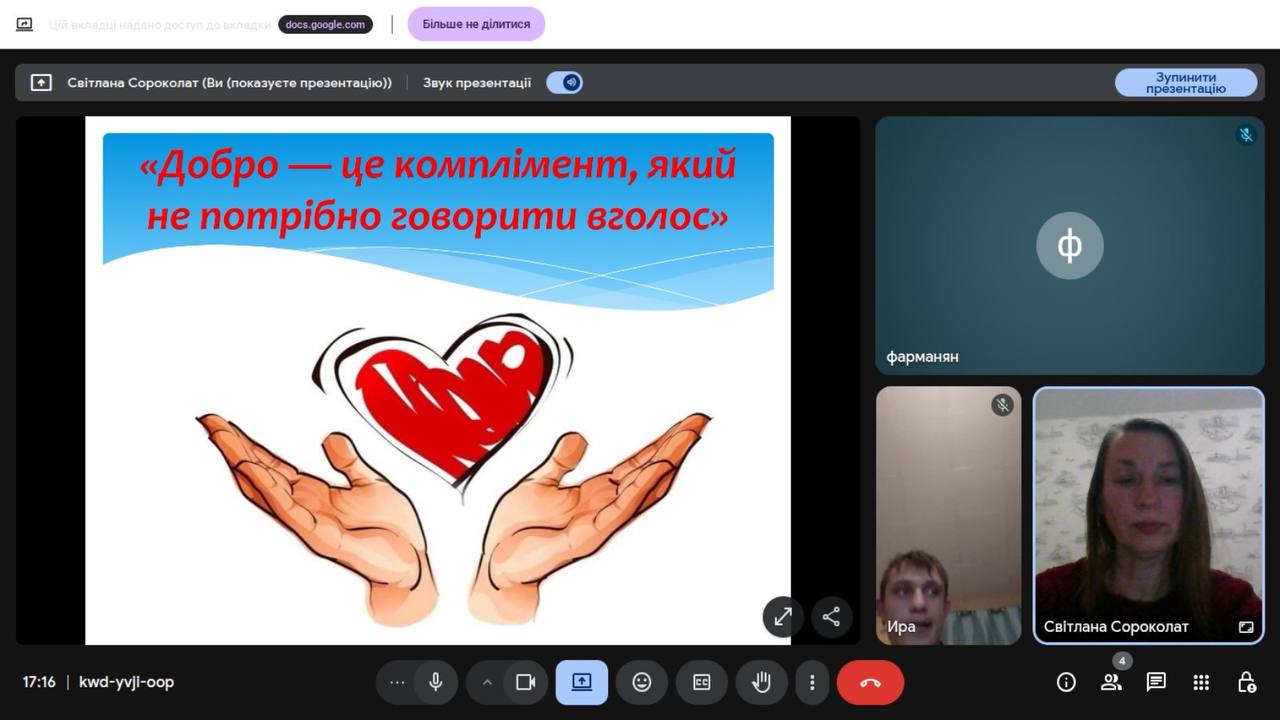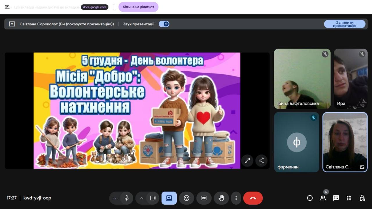 5 грудня Україна та світ відзначають Міжнародний день волонтера. Вихователі закладу нагадали учням, хто такий волонтер та розповіли про їх не легку роботу. Під час онлайн-зустрічі педагоги роз’яснили суть поняття «волонтер», «волонтерська діяльність»; ознайомили учнів з основними характеристиками та видами волонтерської діяльності; окреслили взаємозв’язок між волонтерською діяльністю та розв’язання соціальних проблем громади,