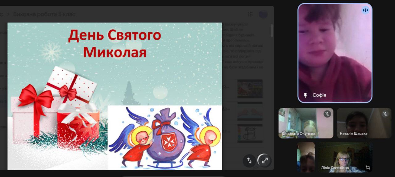 Свято Святого Миколая — це чарівний день, коли кожен учень очікує на маленьке диво. Учні закладу провели теплу, добру й святкову онлайн-зустріч, де не забули і про добрі справи. Святкування розпочалося з пісні про Святого Миколая. Здобувачі освіти пригадали традиції, обговорили добрі вчинки, які дарують радість іншим, відгадувати зимові загадки, проходили новорічні квести, слухали веселі історії, малювали та виготовляли чобітків.