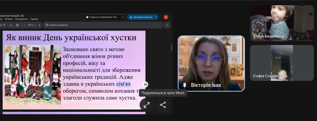 хустку для мами, переглядали презентації та відео ролики, працювали на Jamboard самостійно: прикрасили орнаментом та розмалювали його, прочитали, що символізує хустка для українок. Такі