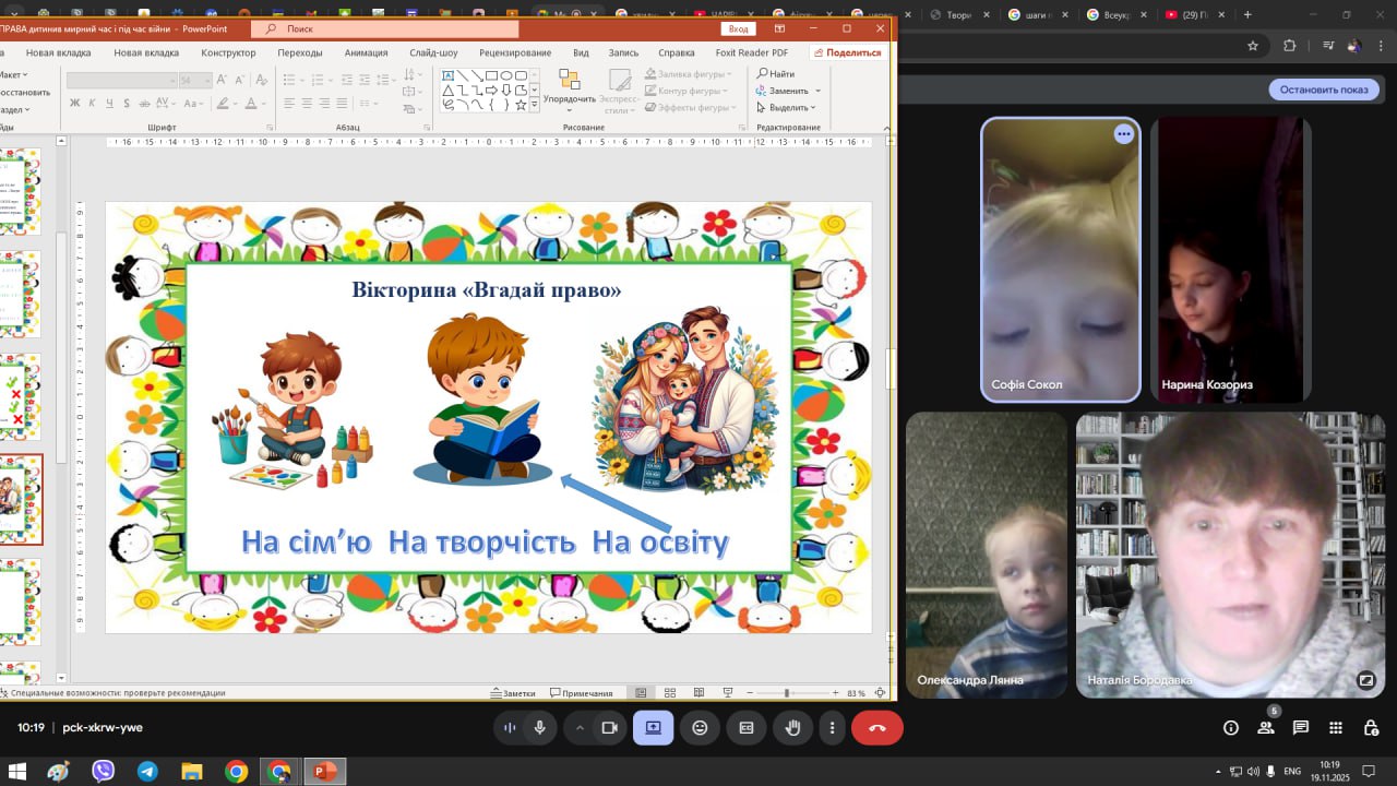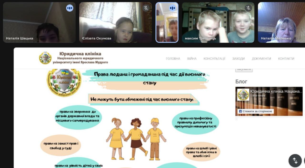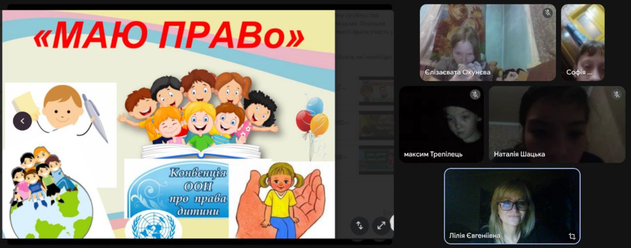лото», на відповідні картинки здобувачі освіти підбирали правильні формулювання, таким чином, продемонстрували свої правові знання. Для 5-9 класів відбулася онлайн-бесіда «Наші права і обов’язки», учні пригадали права, які мають діти у нашій державі згідно «Конвенції ООН про