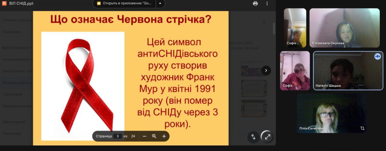 хвороби, взяли участь у практичній частині, де розглядали реальні життєві ситуації, аналізували шляхи уникнення ризиків та обговорювали роль толерантного ставлення до людей, які живуть із ВІЛ. Заходи направлені на обізнаність учнів ВІЛ-інфекцію/СНІД, запобігання та профілактиці захворювання, усвідомлення проблем щодо власного здоров’я та формування толерантності до хворих.