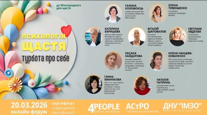 За ініціативи ДНУ «Інститут модернізації змісту освіти» Міністерства освіти і науки України, ГО «Агенція сталого розвитку та освітніх ініціатив» та Освітньої платформи «4People» 20 березня 2026 традиційно наш заклад прийняв участь у Всеукраїнському онлайн-форумі «ПСИХОЛОГІЯ ЩАСТЯ: ТУРБОТА ПРО СЕБЕ». Декламували, обговорювали масу важливих тем психічного здоров’я у буремні часи, виконували психологічні техніки та вправи, насолоджувались естетикою та креативністю презентацій, набиралися спокою, впевненості та щастя. За результатами форуму педагогічні працівники отримали нові знання щодо підтримки ментального здоров’я, відповіді на важливі екзестенційні питання «Чи є щастя під час війни?», «Як турбуватися про себе під час тотальної тривоги, страху та невизначеності?».